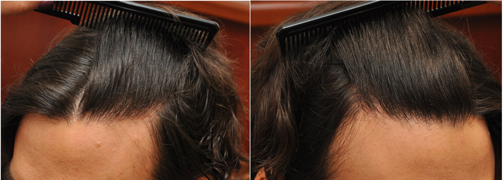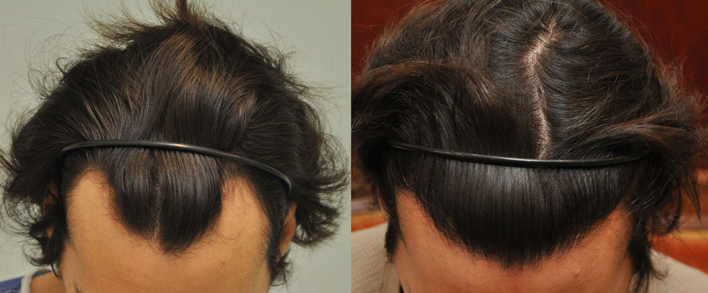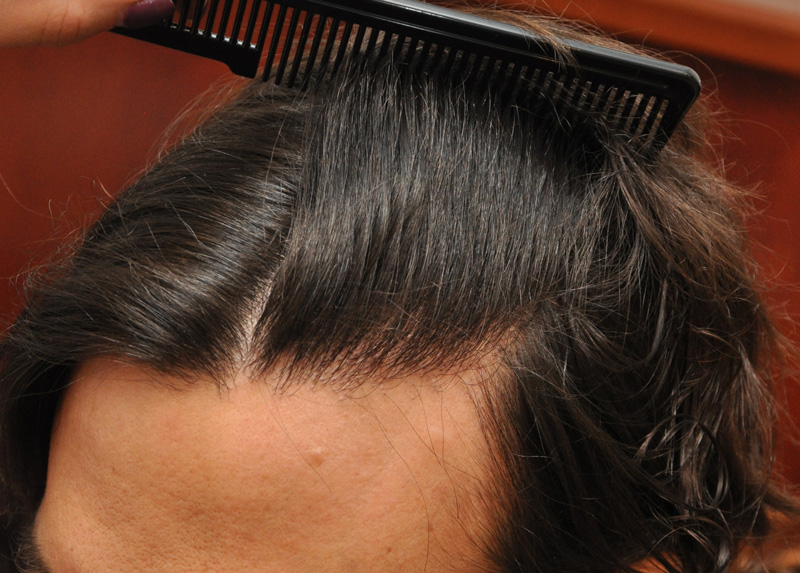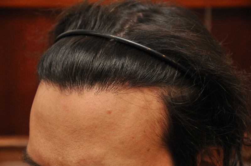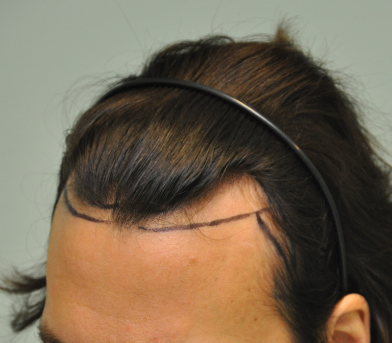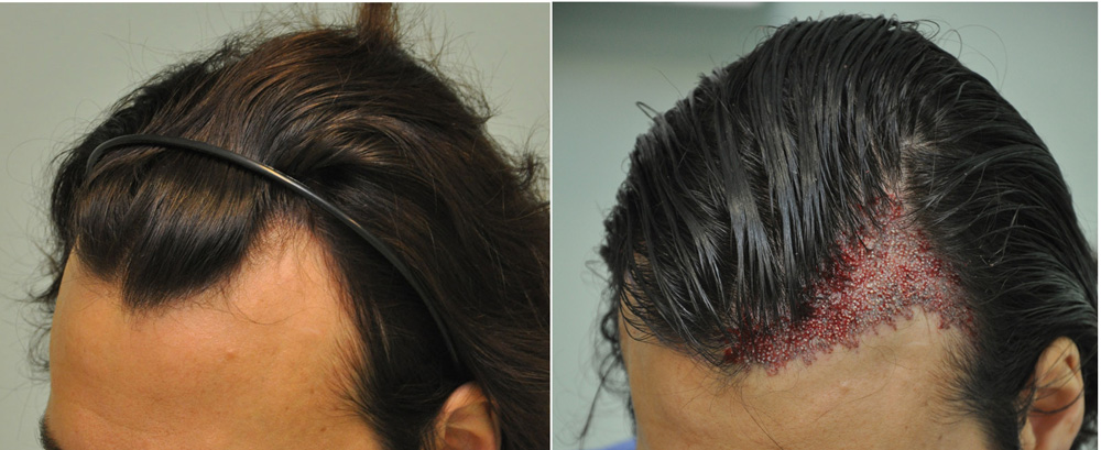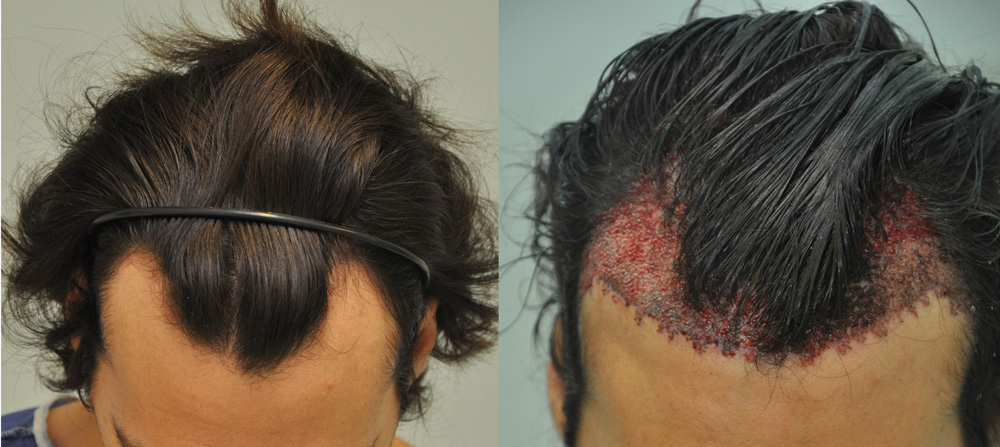 Kiváló sűrűséget és rendkívül természetes hajvonalat alakítottunk ki. Képeken még látszik közvetlenül műtét után a beültetési terület illetve az adóhelyen a kivételi pici sebzések.